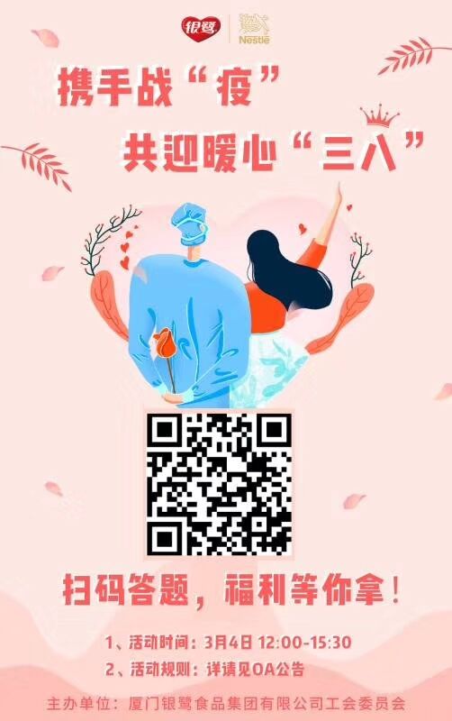 為慶祝節(jié)日的到來(lái),銀鷺食品集團(tuán)工會(huì)委員會(huì),人力資源中心圍繞“攜手戰(zhàn)“疫” 共迎暖心三八“這一主題,開(kāi)展系列活動(dòng),活動(dòng)由廈門銀鷺與雀巢大中華區(qū)活動(dòng)有機(jī)結(jié)合,為女性員工們送上特別的祝福與問(wèn)候。